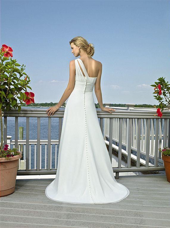 This Adorable One-Shoulder Chiffon and Satin Informal Wedding Dress, shown here in white chiffon over satin wedding fabric, has a beautiful one shoulder design with elegant waist and shoulder details With an elegant button-up back, delicate shoulder strap details, and short sweep train, this gown would be excellent for any destination Wedding, renewal of marriage vows or a beach or garden ceremony This is a lovely Bridal Gown from our online bridal gown store, and the cost of shipping to you is included in the cost of this gown! Neckline Style: One-Shoulder Abito di chiffon per la cerimonia nuziale casual, elegante abito di chiffon una spalla per la sposa, voyage 6505, abito di chiffon per la cerimonia nuziale casual, elegante abito di chiffon una spalla per la sposa, robe de mousseline de soie pour le mariage décontracté Brides who chose this dress, also liked ...