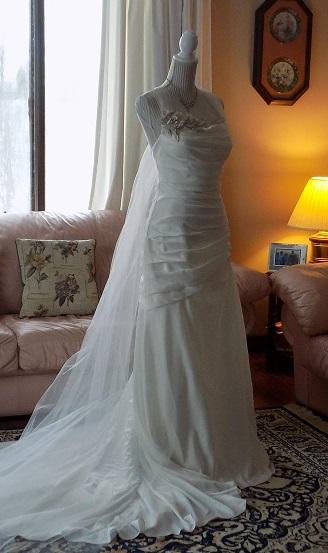 Da Vinci Charmeuse Satin Gown with Tulle Train in stock size 12