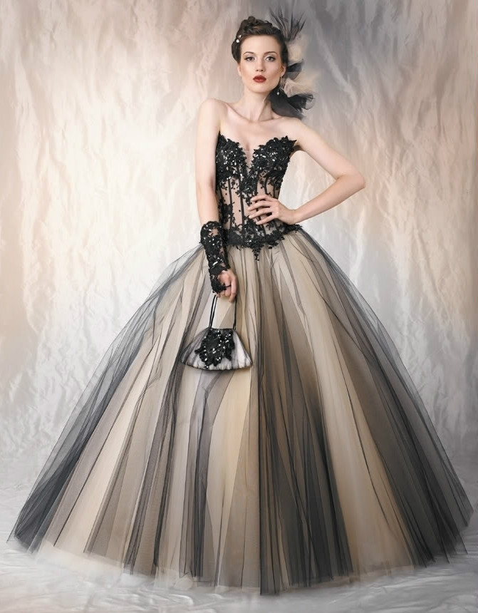 This black lace and tulle strapless sweetheart ballgown is dramatic and beautiful - with an elegant strapless lace bodice and a full tulle over satin skirt Charming and elegant, this affordable Strapless Wedding Dress is from our selection of inexpensive Bridal Wear and can be made with or without a train This gown is better than Wholesale and great for a Bride on a budget! For a short video on how to Lace your Wedding Gown Click here for Size Chart Brides who purchased this gown, also liked .....