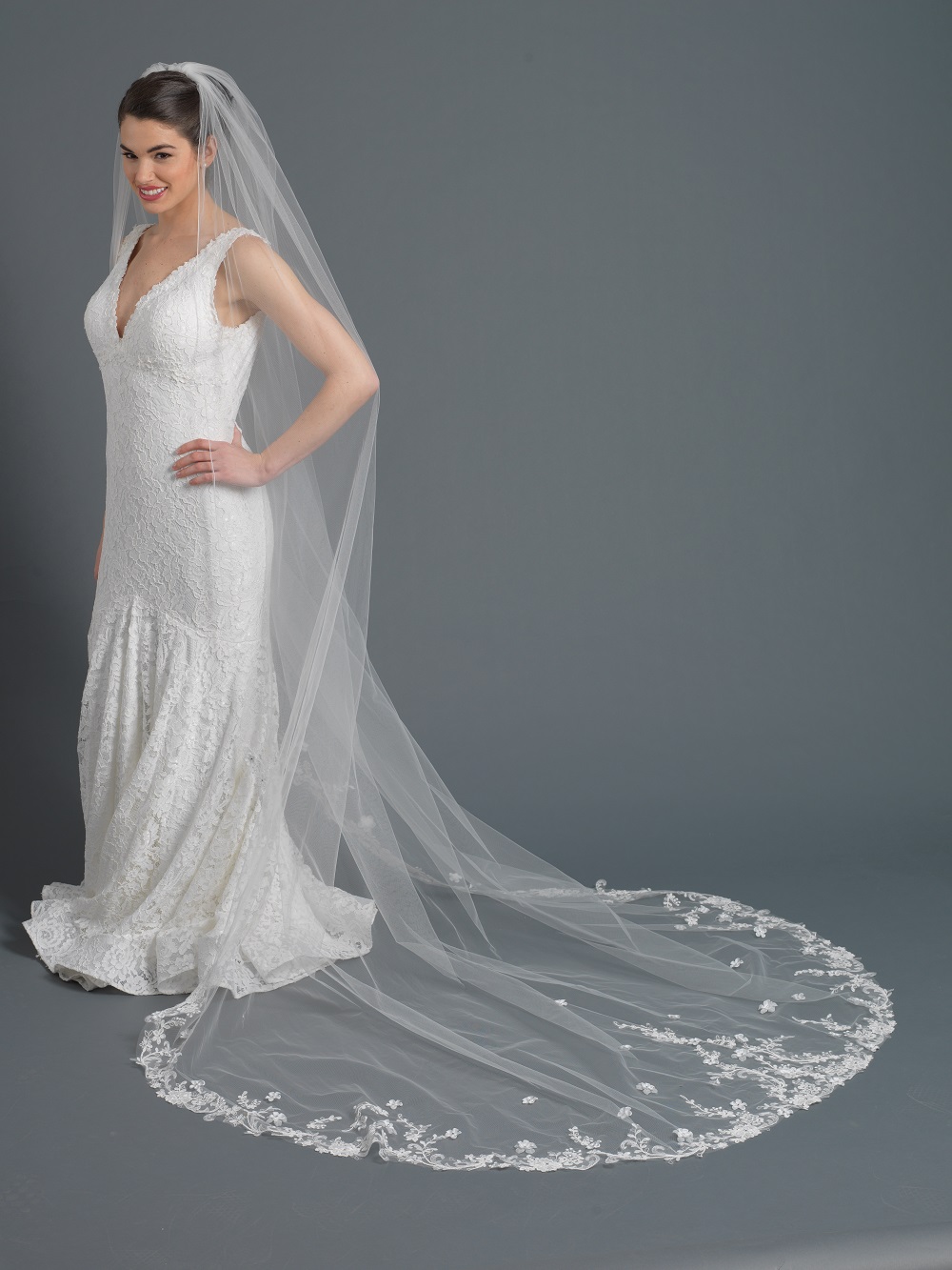 The lovely Chichester Cathedral Length Wedding Veil is a Single Layer Wedding Veil, has floral embroidery and rhinestone accents and is available in the colour Ivory This is one of our most beautiful Bridal Veils and will compliment almost any Wedding Dress whether you wear a traditional or contemporary Bridal Gown Colour: Ivory Length: Cathedral Length Layer: 1 Layer Affascinante velo per la sposa, véu de noiva elegante, sjarmerende slør for bruden, modieuze Bridal Veil, jolie mariée de voile This veil would look lovely with ......