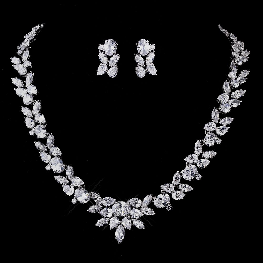 Cubic zirconias adorn the entire piece in a stunning pattern that allows the stones to capture the light brilliantly, and the earrings display the same qualities as the necklace, making the set wonderful for any special occasion!