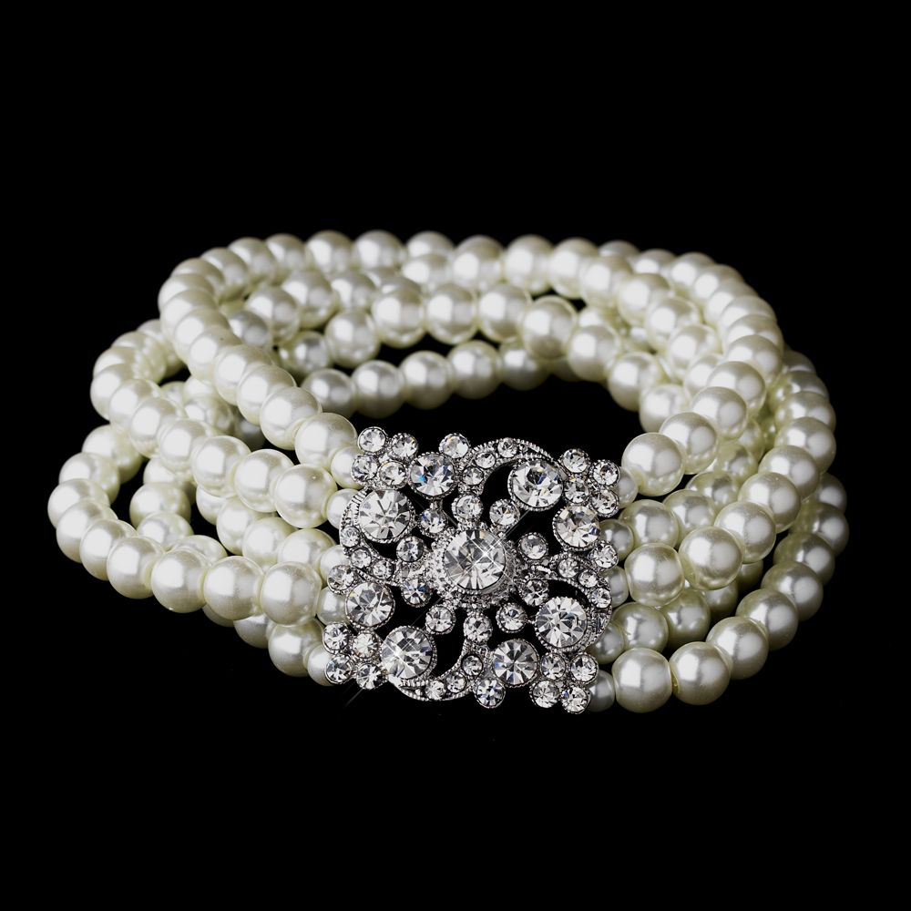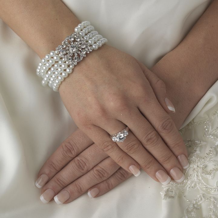 This Elegant White or Ivory Faux Pearl Bracelet with silver charm encrusted with clear crystals is a beautiful accessory for any Bride on her special day