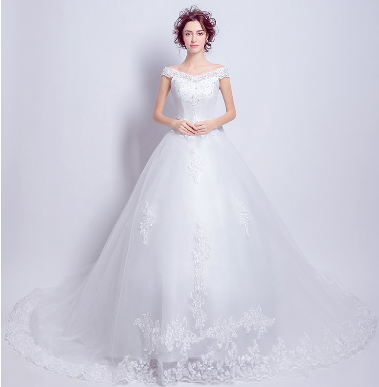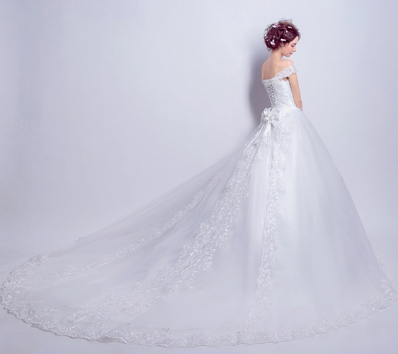 This gorgeous off the shoulder embroidered Organza Wedding Gown has a lace-up back and dainty embroidery around the neckline and a long Cathedral length embroidered train with a bow at the back of the gown You will love the charming bodice deatails of this elegant gown, shown here in White This Bargain Wedding Dress is $385.00, and is one of our Wholesale priced Organza Wedding fabric Gowns Style: A-Line / Princess Neckline Style: Off-the-Shoulder Sleeve Length: Sleeveless / Cap Sleeves Brides who purchased this gown, also liked ...