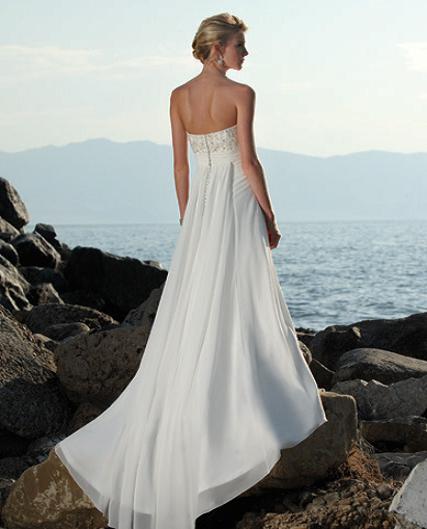 This Strapless Empire Line Bateau Neckline Chiffon Beach Wedding Dress has beautiful embroidery on the modified Sweetheart neckline and bodice, and softly draped fabric on the skirt and train From the charming neckline, to the exquisitely draped short train and elegant back, this lovely gown has a graceful look that is flattering and feminine The total price, including shipping, is $345.00 for this beautiful, affordable destination Wedding Dress Shape Style: Empire Line