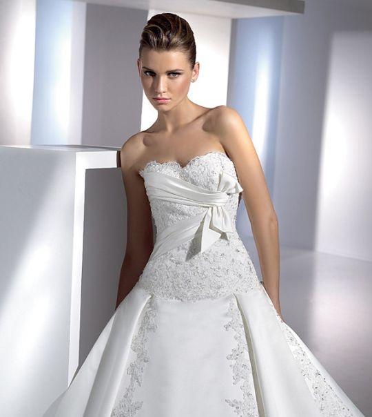 This Exquisite Strapless Satin Princess Style Ball Gown with a feminine lace detailed bodice, dropped waist and lace wedding fabric on the bodice, skirt, and train This elegant Wedding gown has flair and style and has a lovely Chapel train and is one of the elegant bridal gowns from our range of budget priced wedding attire priced at $355.00 at our online Wedding gown store! Shape Style: Princess / Ballgown Brides who purchased this gown, also liked ...