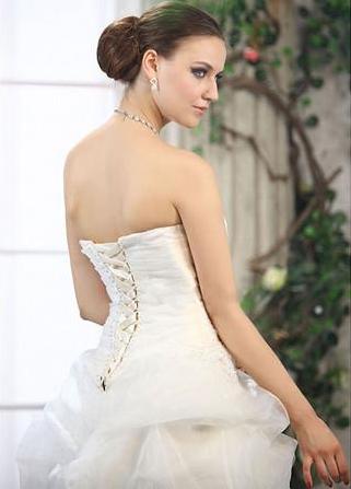 This Glamorous Strapless High-Low Organza Wedding Dress has a natural waist, is well made with built-in bra, corset style lace-up back closure and is fully lined