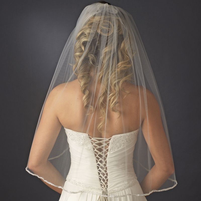 The pretty Gloucester Wedding Veil is a pretty Elbow Length Single Layer Tulle Veil with hand sewn bugle beads and tiny pearls