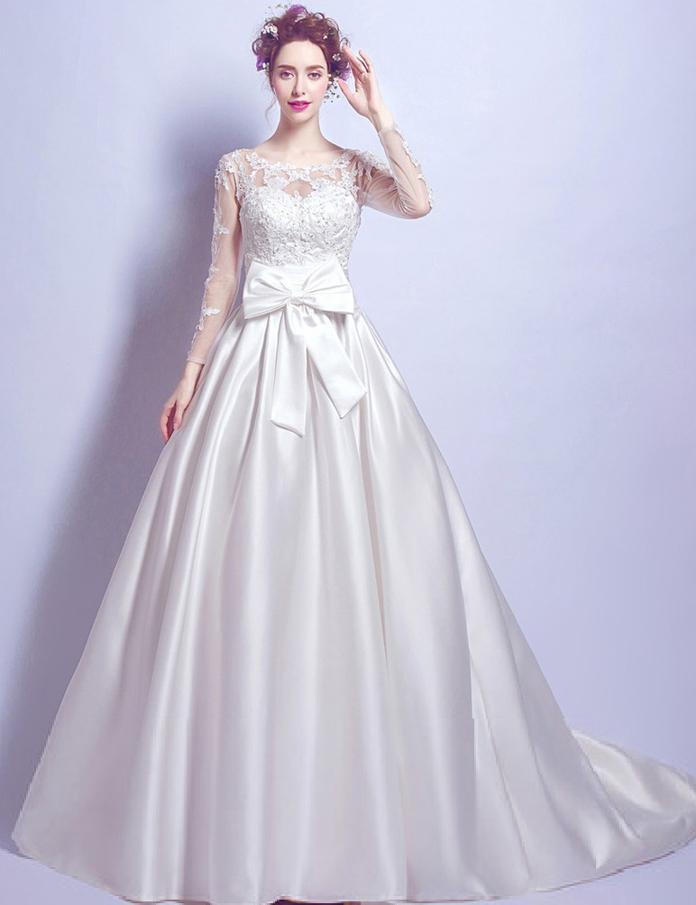 The Lovely Satin and Lace Bridal Gown has a pretty sweetheart neckline, button-up back, long sleeves, a natural waist with decorative bow, and is shown here in white satin wedding fabric This is a lovely Wedding Dress, suitable for a formal or casual wedding ceremony, and is affordably priced and includes delivery from our on-line bridal wear store! Shape Style: Princess Abito da sposa in raso sfera, colección de satén y organza vestido de bodas, morilee blu, Satin Hochzeit Ballkleid, Satinat vestit de bola, satinado elegante y vestido de encaje para la novia, elegante raso e pizzo abito per la sposa Brides who purchased this gown, also liked ...