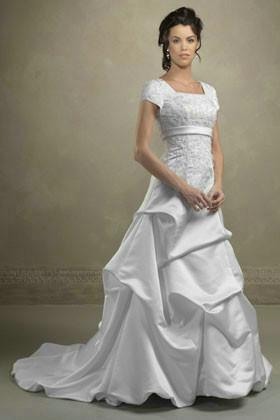 This charming Modest Satin and Lace Wedding Gown, has a square Neckline, short sleeves, a high waist on the Lace bodice and an A-Line skirt and train, and is suitable for an LDS Wedding This affordable and comfortable Bridal Dress is priced at $330.00, and is available in sizes 2 - 30 Suitable for a Wedding where the Bride would like her shoulders modestly covered, and from our collection of Wholesale priced Bridal wear, the cost of this lovely Wedding Dress includes shipping and handling and is one of our Bargain Wedding gowns Shape Style: A-Line / Princess Brides who purchased this gown, also liked ...