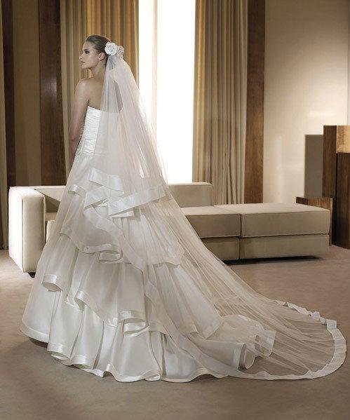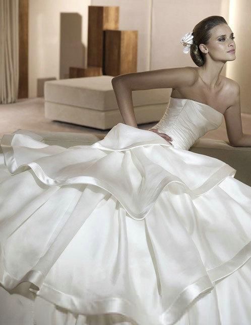 This floor length Stylish Strapless Satin A-Line Bridal Gown has a simple straight neckline and this elegant Euro-styled Bridal gown is perfect for a formal Church wedding This elegant Satin Wedding dress has a natural waist, pretty satin edged layers around the skirt and train, a Chapel length train and a back zipper closure Shape Style: A-Line Brides who purchased this gown, also purchased ...