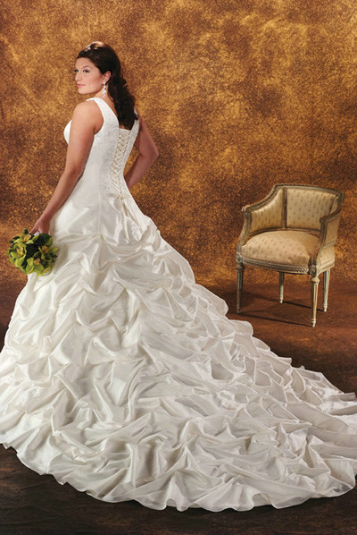 This beautiful Queen Size Sweetheart Neckline Taffeta Ballgown has comfortable wide shoulder straps, a dropped waist, corset style lace-up back for a perfect fit, and pick-up gathers and ruffles, which all make this Wedding Dress unforgettable The Sweetheart Neckline is alluring and captivating, and this Plus Size Wedding Gown would be perfect for your formal or informal wedding Delicate and flattering, this bonny Wedding Dress is a dream dress for a Destination Wedding or Summer Garden Wedding Shape Style: Ball Gown Belle encolure d'amoureux de taffetas Ballgown, Bonny Bridals collection style 1818, hermoso vestido de novia de escote tafetán para la novia, vakre Sweetheart Halskant taffeta kjole for bruden Brides who purchased this gown, also liked ...