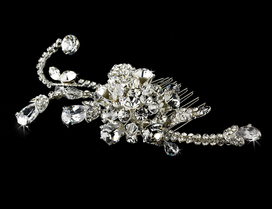 This Vintage-look Swarovski Crystal Bridal Comb has light-catching rhinestones and this bridal comb features a unique floral design with rhinestone buds and silver leaf details stretching past either side of the piece