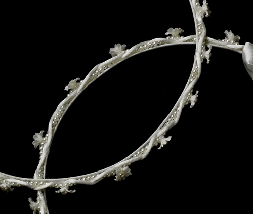 This pair of Wonderful Greek Stefana Wedding Crowns features tiny fabric flowers with faux pearl centers These sit atop a delightful braid pattern made from two silk cords and a strand of luminous faux pearls An elegant double bow in the back, is made from lovely silk ribbons which will be tied together to join the two Stefanas during the Crowning Ceremony in the traditional Greek Orthodox wedding, after they have been blessed by the Priest The crowns symbolize the honor and glory that God has bestowed upon the couple, and the tied ribbons symbolizes that they are being united in Marriage These Stefana crowns are available in White or Ivory Size: 7” diameter with a 22” circumference and 48” long ribbons Brides who bought these Stefana, also liked